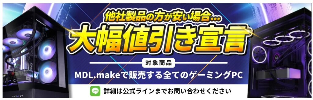 MDL.makeは2023年に登場した新興BTO PCショップで大手と比較すると1万円~2万円ほど安いのが特徴です。(ただしメモリ高騰に伴い、モデルによっては以前と比べるとそうでもない場合もある)