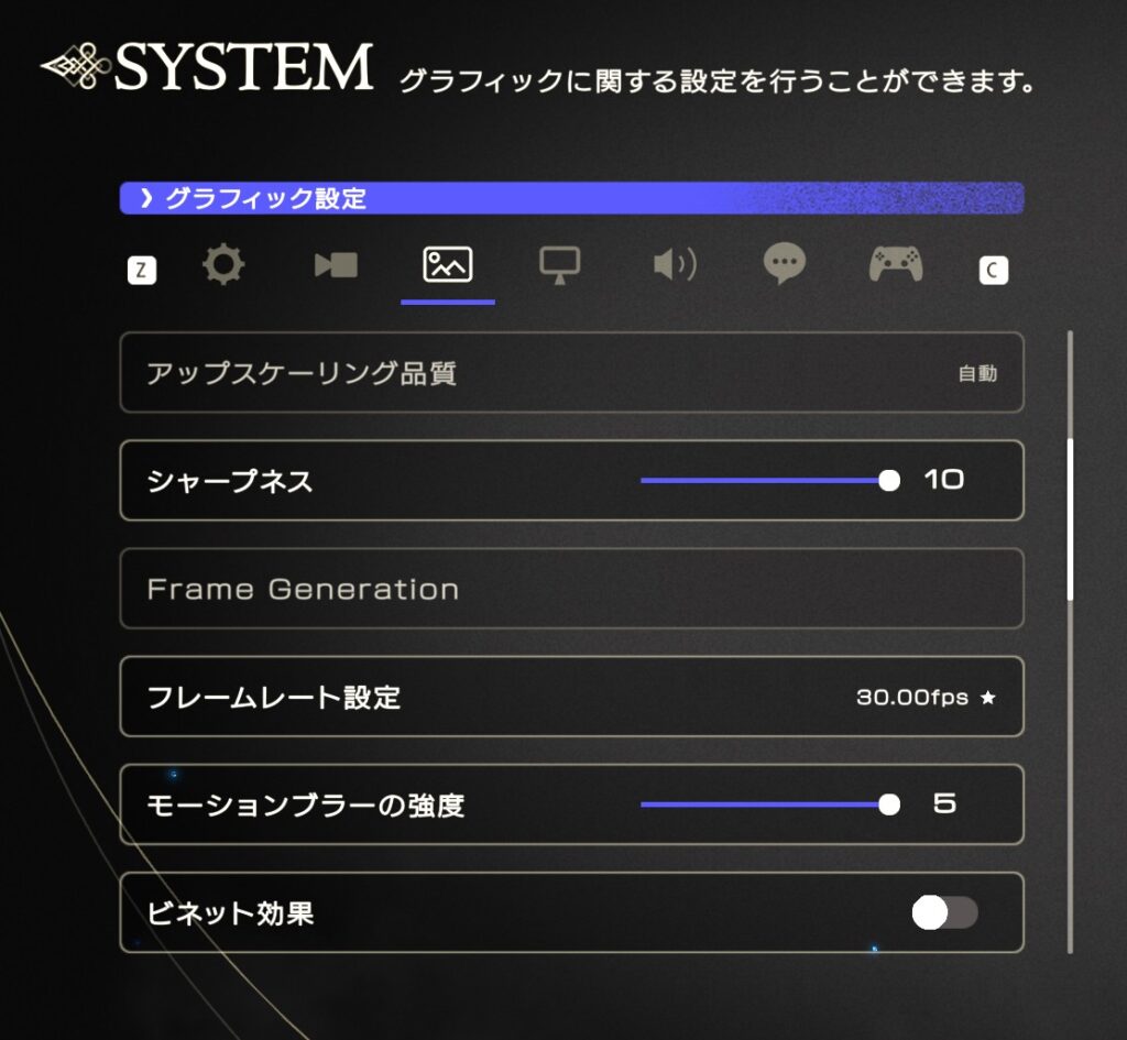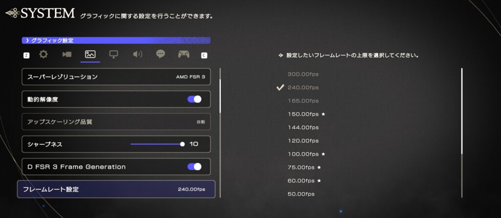 グラフィック周りの設定(デフォルト)は以下の2枚の画像のようになっていました。よくわからない場合はデフォルトのままでゲームを始めるのが一番良いです。ただし、フレームレート設定は星印が付いたfpsが推奨です。