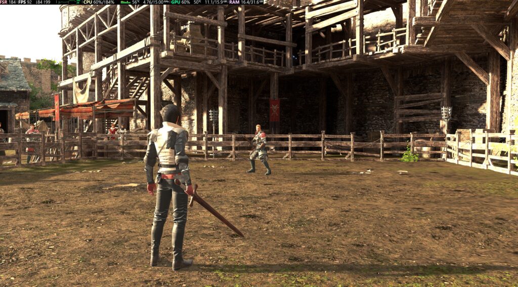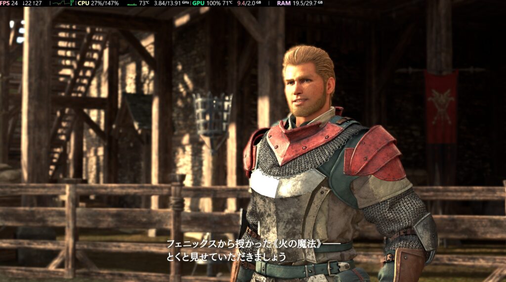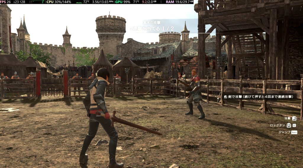下の画像は中設定30fpsですが26fpsが限界。アクションゲームを普通に遊ぶのに必要なフレームレートは30のため、この数値だと全体的にもっさりした動きで攻撃アクションをするたびスローモーションになります。