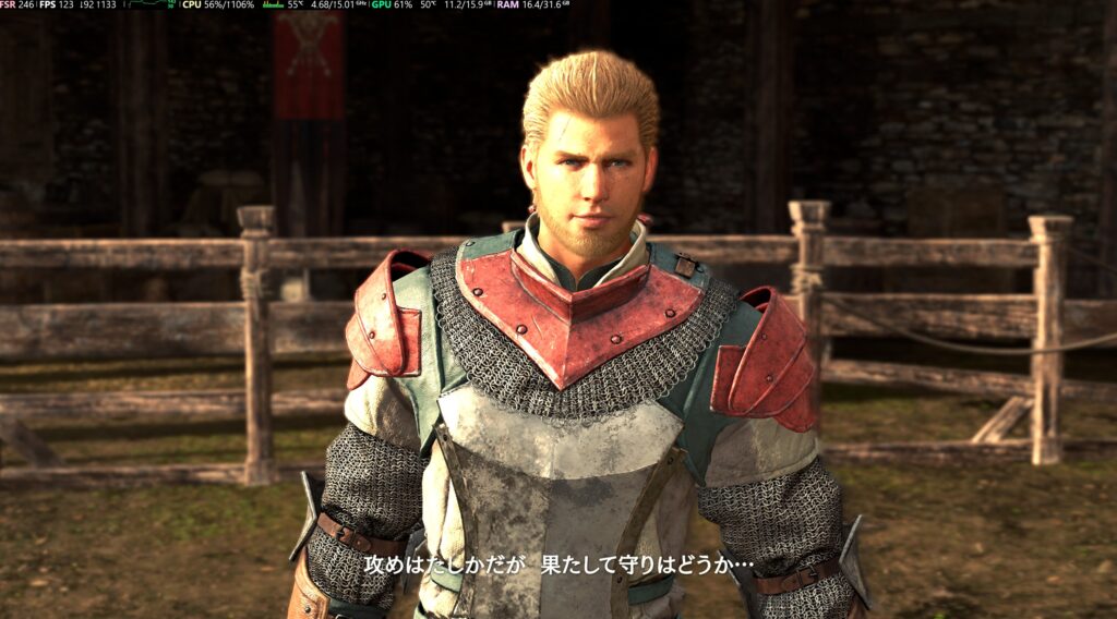 ですが、筆者としては中設定でも十分きれいですし、ヌルヌル動くので不満は全くなく、上下の画像(上は左側)はさすがPC版といったところ。FF16のPS5版は全クリしていますが、全体的に薄暗くぼやけたシーンが多かったので画質にこだわる人はパソコンでのプレイがおすすめです。