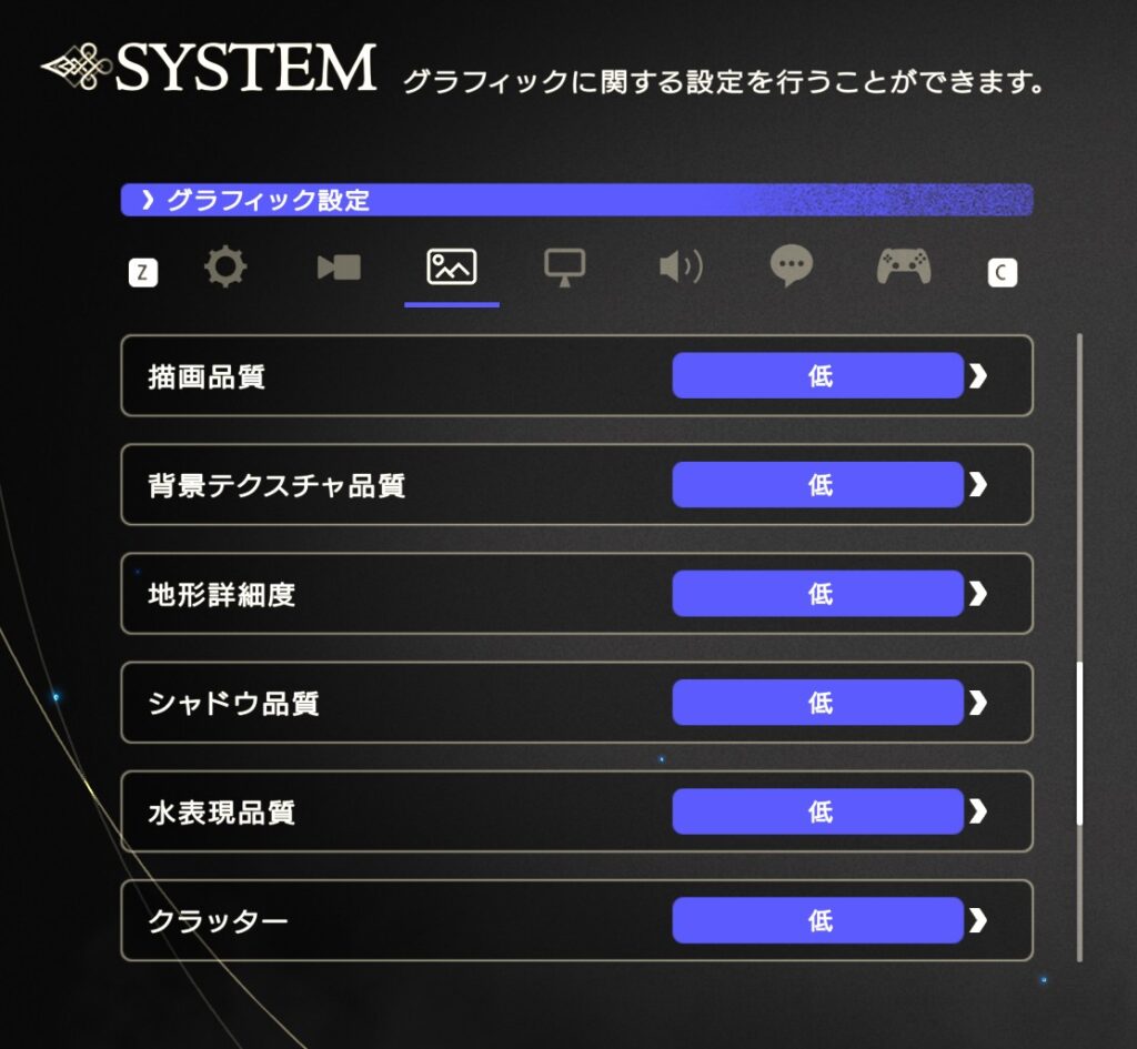 結論としてグラボなしミニPCでもFF16は起動・プレイは可能で以下のように「低」設定30fpsがデフォルトです。