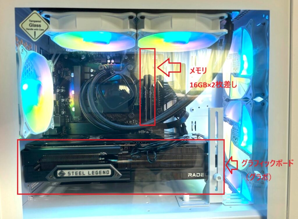 上記画像はデスクトップ型ゲーミングPCです。メモリとあるのがこの記事で言っている一時的にデータを保存するパーツとなります。