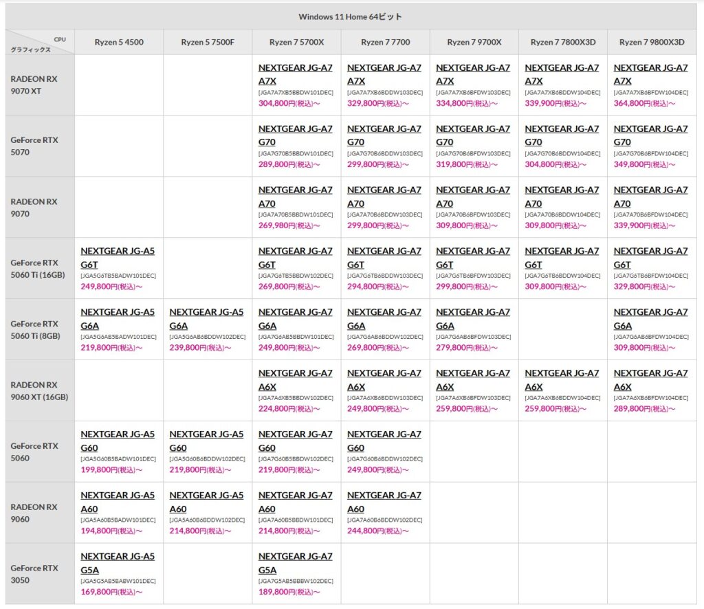 | 詳細 | ・7700Xは万能型ミドルCPU ・i7-14700Fは万能型高性能CPU ・5060Ti/9060XTはFHDであれば快適 ・RTX5070はWQHDも視野に(高性能グラボ) |