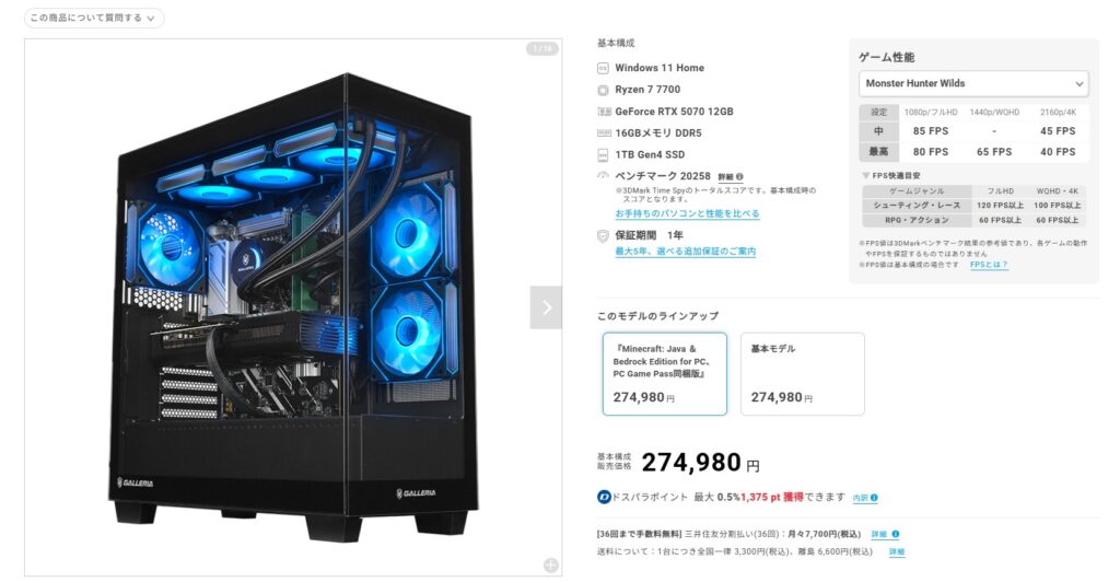 ドスパラはゲーミングPC購入金額に応じた「ドスパラポイント」が付与されます。